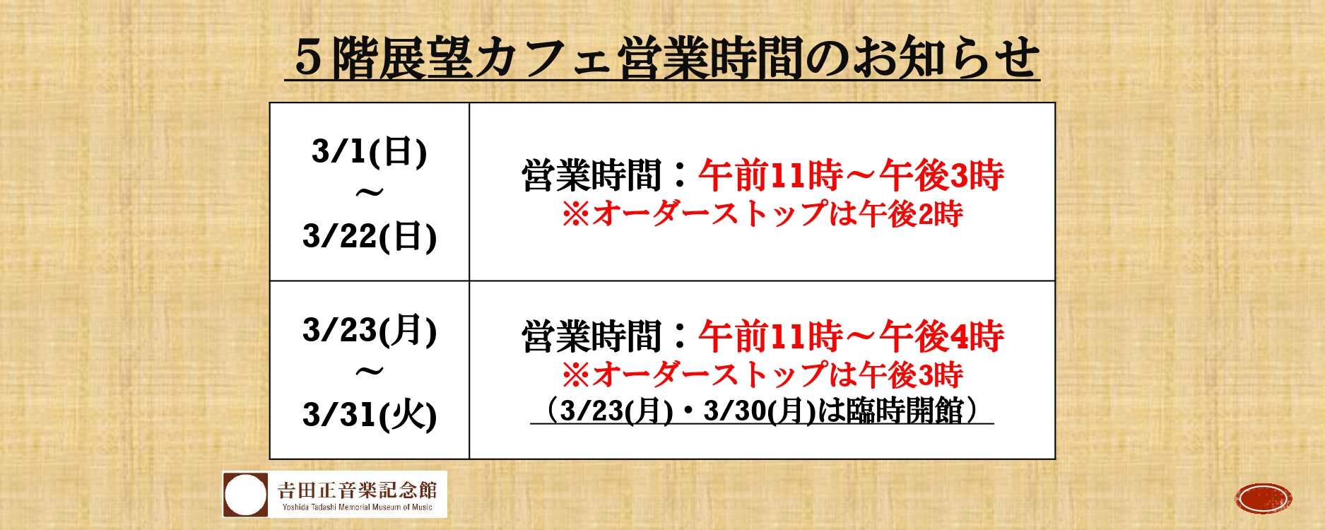 - 【重要】2月22日(月)より時間を短縮して開館します