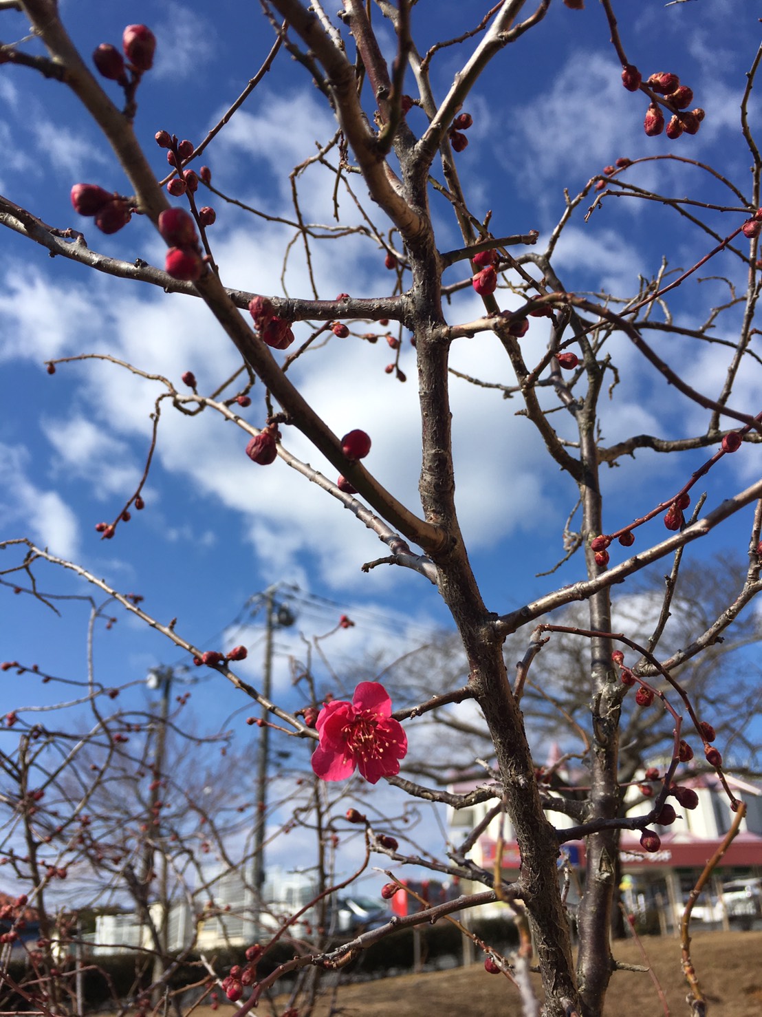 記念館にある「吉田家の紅梅」が白梅より数日遅れで咲き始めました。とても鮮やかなお色です。