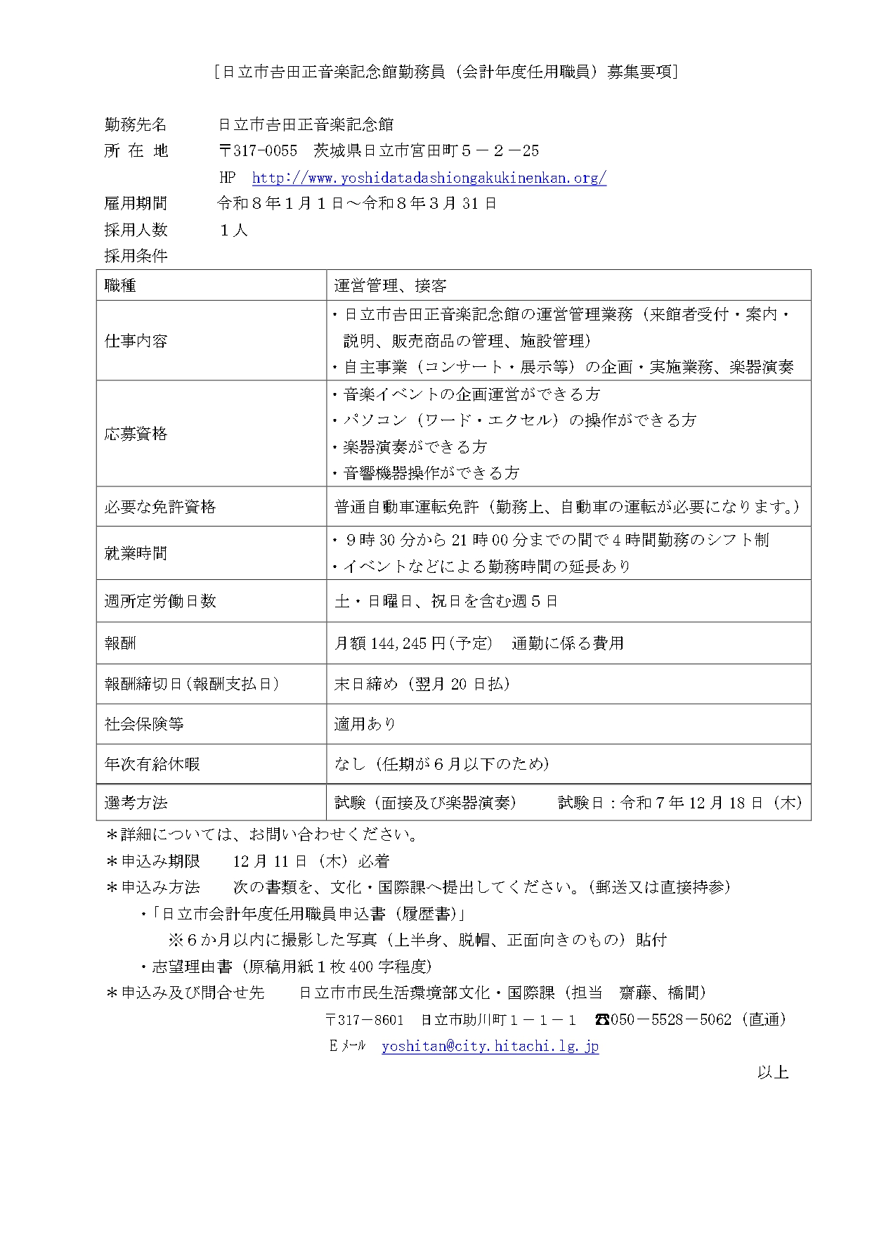 お申込み及びお問合せ:日立市市民生活環境部文化・国際課(担当:齋藤、橋間)